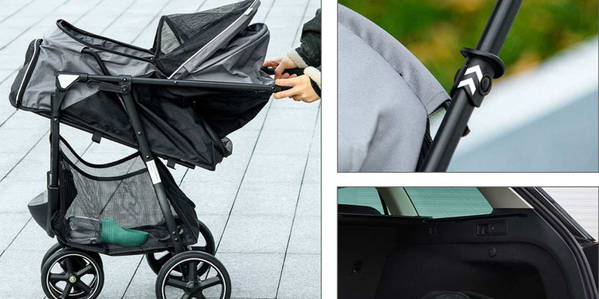 Kočík je ľahko skladovateľný. Behom chvíľky zložíte celý kočík a môžete ho uschovať, alebo pripraviť na prevoz autom. Pokiaľ len chcete psovi dopriať počas jazdy skvelý výhľad, stačí rozopnúť a otvoriť 3-stupňovú skladaciu striešku.