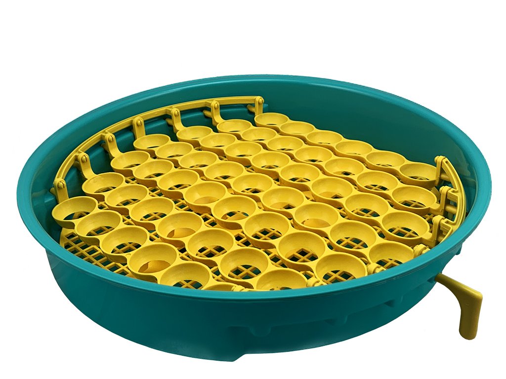 Otočný rošt s páčkou dáva kontrolu nad otáčaním vajec do vašich rúk, ale je možné ho vybrať a inkubovať vajcia na mriežke doliahne. Na mriežku doliahne umiestňujeme väčšie kačacie alebo husie vajcia, ktoré by sa do liahne nezmestili nastojato, otáčajú sa potom ručne aspoň dvakrát denne. Keď si k tejto liahni zaobstaráte aj liesku na prepeličie vajcia, tak budete pripravení na liahnutie akejkoľvek hydiny. | |