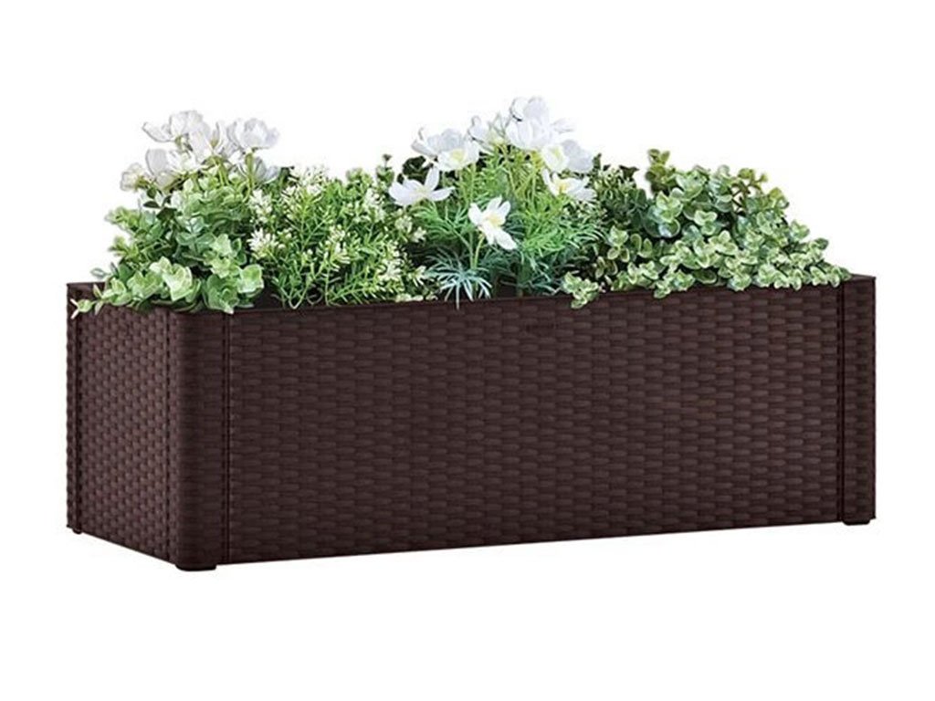 Kvetináče so samozavlažovacím systémom a ukazateľom hladiny vody z plastového materiálu o objeme 90 l a rozmeroch 100 x 43 x 33 cm. Tento kvetináč je vyrábaný z odolného polypropylénu, ktorý je vhodný pre ako vnútorné, tak vonkajšie použitie. Jeho dizajn pripomína štruktúru pravého ratanu. Tento vyvýšený záhon má dostatok miesta pre široké spektrum rastlín a kvetov. Navyše je vybavený systémom automatického zavlažovania a indikátorom hladiny, ktorý bráni nadmernému zalievaniu. Moderný ratanový dizajn v elegantnej moca farbe, sa ľahko zladí s akoukoľvek terasou alebo záhradou, a vytvorí s rastlinami zelenú oázu pre relaxáciu.